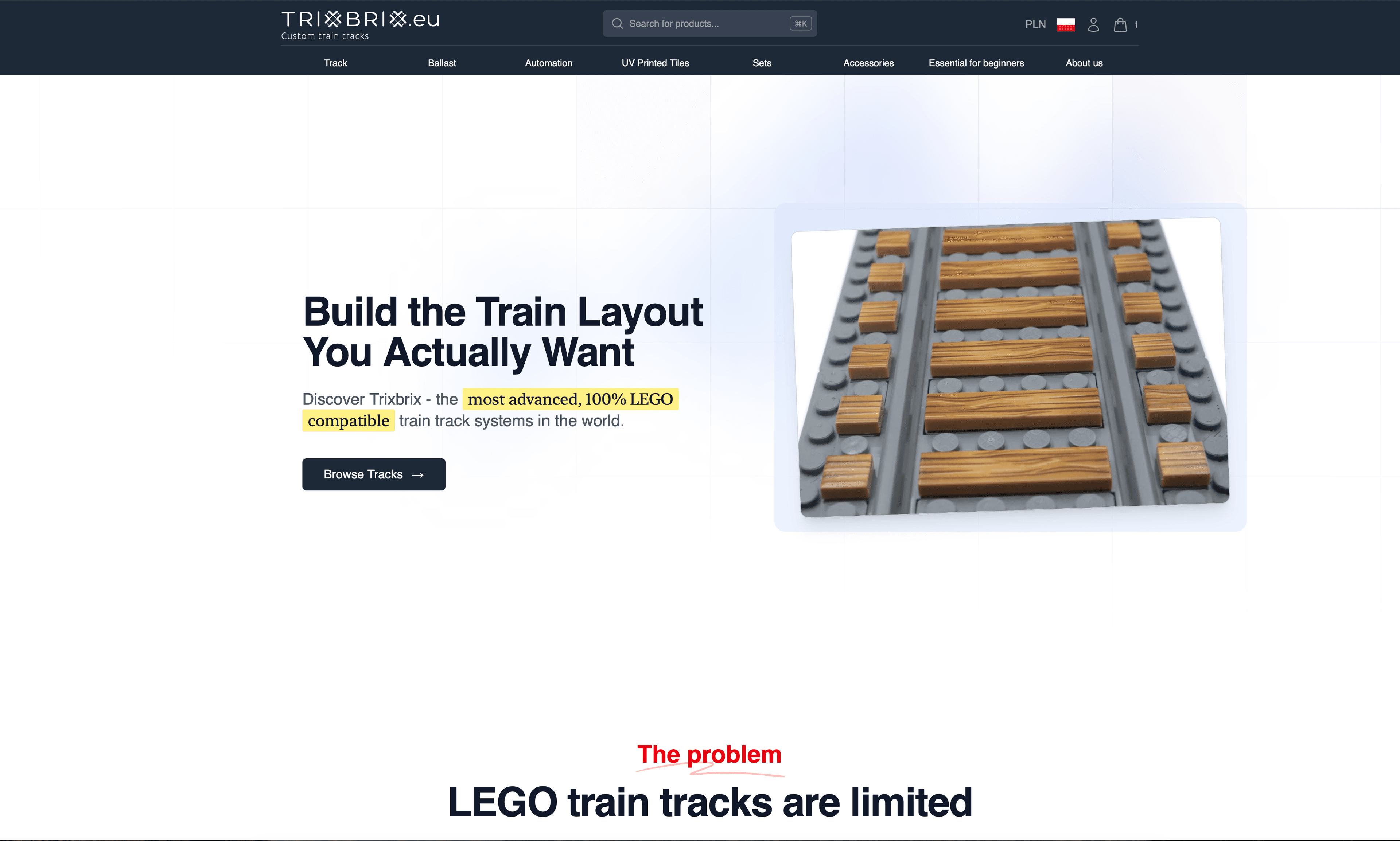 Sklep internetowy dla TrixBrix - producenta najbardziej zaawansowanych torów kolejkowych kompatybilnych z LEGO. Sklep obsługuje pełen katalog produktów z kategoriami takimi jak tory, automatyka, zestawy i akcesoria. Zbudowany w Ruby on Rails z Tailwind CSS. Zobacz shop.trixbrix.eu